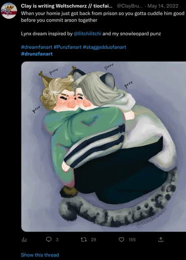 That was the breaking point. Tubbo burst into guffaws as Ranboo stood back up, picking leaves out of their sheet. The white fabric was stained with mud, and a horrified look was on Ranboo’s face. “I hand-sewed this!” they cried, devastated.