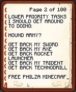 | Description | Techno's Will is a book written by Technoblade, given to Phil before his prison visit on June 6, 2021. Phil opened the first page of the will on September 14, then revealed the rest of the pages for a subgoal on September 20.[62][63] | |