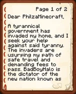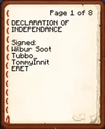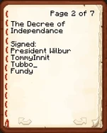 | Description | Independance, also known as the Declaration of Independance, was written by Wilbur on July 29, 2020, to declare the separation of L’Manberg from the Greater Dream SMP.[2] It was destroyed during the Doomsday War. | ||