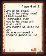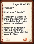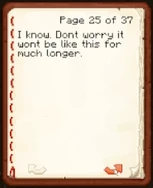| Description | Dear Friend is a book written by Niki in between Tommy and Wilbur's exile from L'Manberg and the Red Festival. It is addressed to an unknown person, and has not resurfaced since it was written. It has only appeared in one edited YouTube video that had a lot of pages cut out of it.[7] Most of page 4, pages 5-8, pages 11-18 and the end of page 19 were transcribed from the audio of the video, so they may be incorrectly formatted. |