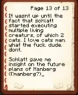 If you are caught in possession of this diary, an immediate execution may result by authority. - Schlatt has a severe addiction to alcohol and cigarettes to suppress his aching body. He is unwilling to get it checked due to his pride. If the symptoms progress, he might suffer fatal concequences.