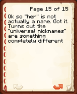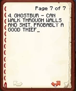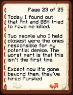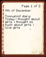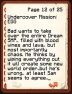 | Description | A Spy’s Diary is a book written by Fundy while he was acting as a spy during Schlatt's regime of Manberg. The book was shown to the members of Pogtopia on November 7, 2020.[8] It remained unsigned for several months until Ghostbur asked Fundy to sign it on November 24, 2020 for the sake of his library. It was destroyed during the Doomsday War. | ||