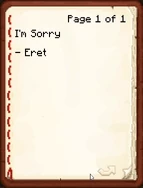 | Description | A book given to Eret by Wilbur after their conversation on May 19, 2022.[69] Wilbur originally told them to open it at least three months later, but he later asked Eret on August 2, 2022 to postpone the opening by a month.[70] Eret opened the book on September 2, 2022. They thought that perhaps the "desert" could refer to the poem Ozymandias, a poem that Wilbur was fond of. Eret put the book in their museum.[71] | |