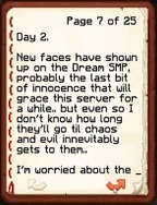 stand in this war. Am I on the right side. Luckily, due to schlatt's idiocy, he is unaware of how an enderchest works. What an idiot. I barely got away, and sccessfully stored the diary in an enderchest. Day 5. I have decided to supply myself with a FAKE DIARY, in worst case secenario.