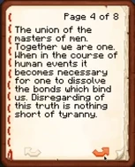 This book declares that the nation which shall be henceforth known as L'Manberg is seperate, emancipated and independant from the nation of DreamSMP.The union of the masters of men. Together we are one. When in the course of human events it becomes necessary for one to dissolve the bonds which bind us. Disregarding of this truth is nothing short of tyranny.