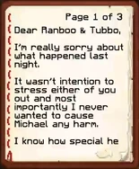 | Description | On May 30, 2021, Ranboo wrote a letter to Wilbur and placed it inside a chest in the attic of Phil's house.[58] | |