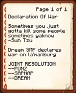 | Description | War was written by Dream on July 29, 2020 to declare war on the newly formed nation of L'Manberg.[1] The book (along with the nation) was destroyed during the Doomsday War. | ||