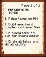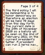 | Description | 2020 Election was written by Wilbur on September 3, 2020, to keep track of the upcoming L'Manberg election. It was destroyed during the Doomsday War. | ||