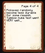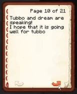 | Description | A book left by Tommy for Tubbo right before Tommy went to act as bait so that a nuke could kill Dream and Punz.[75] The contents of the book were revealed on a non-lore stream by CaptainPuffy.[76] | |