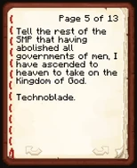Tell the rest of the SMP that having abolished all governments of men, I have ascended to heaven to take on the Kingdom of God. e | |