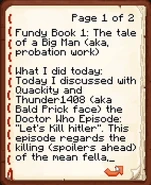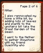 The next day, Tommy wrote Fundy his first report, and unsurprisingly, it was unsatisfactory. Fundy and Tubbo decide to let him off just this one time. Later on, Tubbo ordered Ranboo to take down Tommy's bulletin board of things banned in L'Manberg. Tubbo and Ranboo then went to build a meeting room in the confines of the Holy Land to prepare for the meeting taking place the next day.