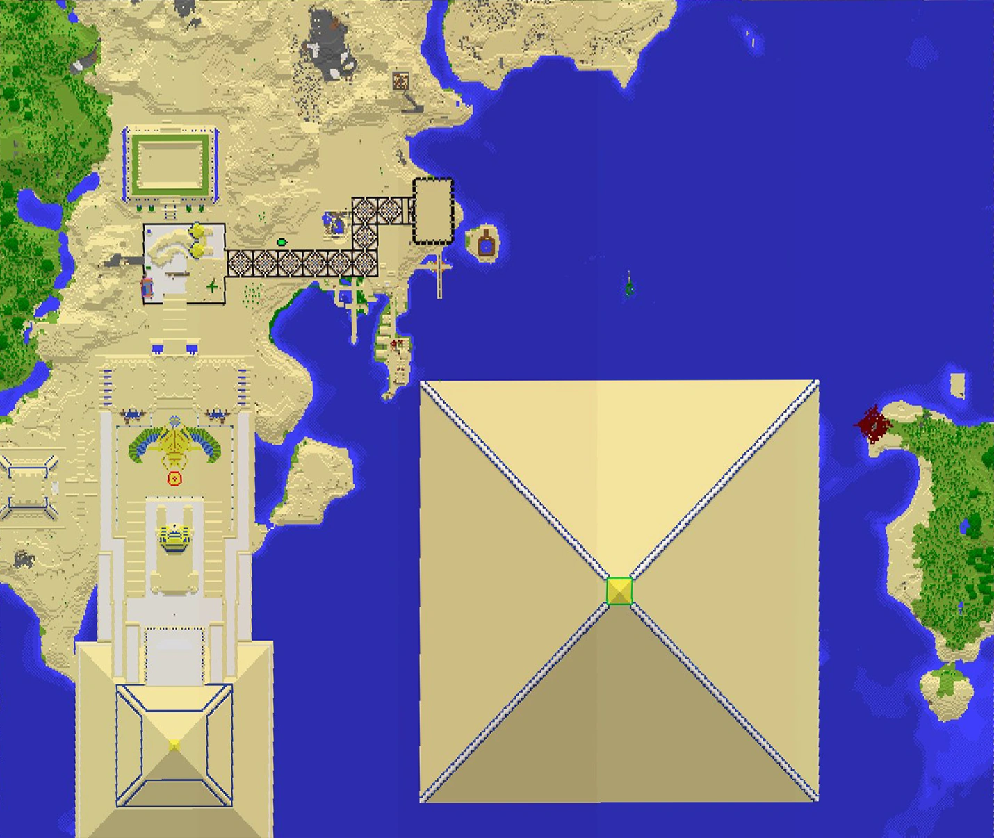 At the back of the temple is a massive structure reminiscent of a desert temple. However, this temple has been scaled up significantly, contains a beacon at its peak powered by multiple golden blocks, and has blue concrete lines going through it. Above the entrance is the eye of Ra (Horus), composed of emeralds. The center of the area has a marking with four hieroglyphs of totems of undying as well as a symbol in the center and a statue of Anubis.