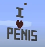 The "YOU <3 LITTLE PENIS" sign originally said "I <3 ANDREA" and was built by George after he lost a chess match to Andrea Botez. Since then, it has undergone many changes, the most notable change being to "YOU <3 LITTLE PENIS," which gave Little Penis Land its name. It was bombed by Drista, Tommy, Technoblade and Sapnap on July 8, 2021, making it just say "ENIS."[30] It was finally taken down by Foolish on July 17, 2021.[31]