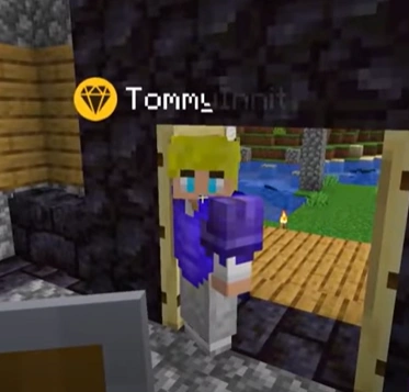 After running up the stairs, Fundy noticed that Tubbo was stood completely still, simply staring blankly. It turned out that Tubbo was AFK, as he was eating a pizza in real life. Fundy saw this as a window of opportunity to murder Tubbo by trapping him in a stone box and filling it up with water, in the hopes that he would drown to death. Tubbo quickly noticed his machinations, and put the water in a bucket. Fundy proceeded to replace the water, only for it to be put in a bucket yet again, rendering his attempts as completely fruitless. Panicking, Fundy almost decided to head downstairs, when he noticed Purpled crouching in a corner.